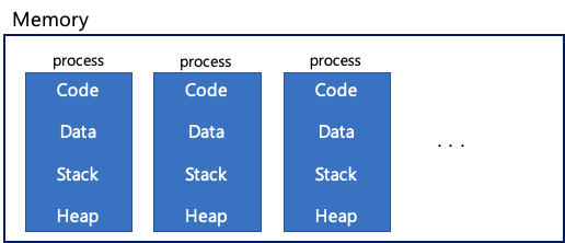 즉, 프로그램이 CPU를 사용할 수 있는 상태가 됩니다. 각 프로세스는 운영체제에 의해서 메모리를 할당 받습니다. 프로세스의 메모리 공간에는 Code, Data, Heap, Stack이 메모리를 분할해서 가지게 됩니다. 이렇게 메모리를 할당받은 프로세스들은 CPU 스케쥴링에 의해 CPU를 차지할 시간을 기다리게 됩니다.