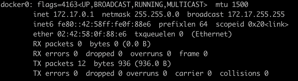 처음 도커를 설치하고 데몬은 구동하게 되면 docker0이라는 네트워크 인터페이스가 생성됩니다. 이는 기본적으로 도커에서 사용하는 가상의 네트워크 인터페이스입니다.
