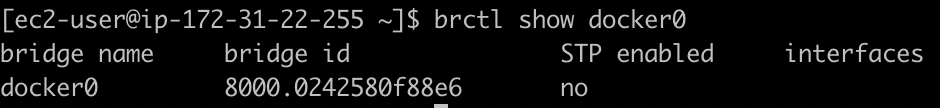 docker0의 네트워크 상태를 확인해봅시다.(현재 어떤 컨테이너도 구동되어 있지 않은 상태이다)