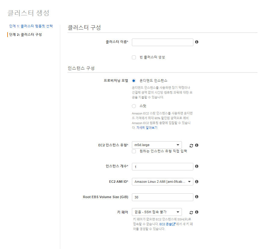 클러스터 구성을 위한 화면에 접근하면 클러스터 정보를 우선 입력한다. 클러스터 이름은 그냥 본인이 사용하고자 하는 이름 적어주면 됩니다. 옵션 중에서 "빈 클러스터 생성" 선택시, 이미지에서 아래에 존재하는 인스턴스 생성에 대한 옵션은 설정하지 않고, 인스턴스가 없는 껍데기만 존재하는 클러스터가 생성되게 됩니다.