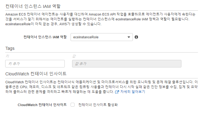 ecsInstanceRole를 새로 생성하여 사용하며, 기존에 이미 존재하는 경우는 생성되어 있는 것을 사용하면 됩니다.