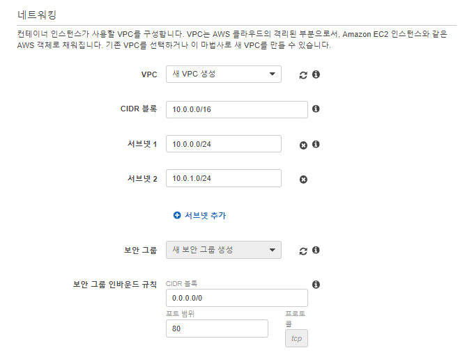설명에 적혀있는 것처럼 기존에 생성되어 있는 VPC를 사용하거나 VPC를 새로 만들어서 사용하면 된다.