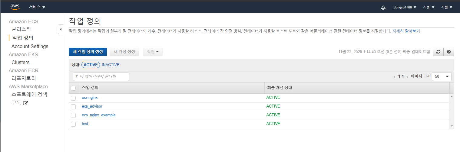 테스크 정의를 완료하고 나면 가장 처음에 설정한 "작업 정의 이름"의 테스크가 생성되며 각각의 테스크는 리비전으로 관리된다. 이렇게 생성된 테스크와 리비전을 통해 이후 서비스를 통해 배포될 테스크에 대한 관리를 진행할 수 있다.