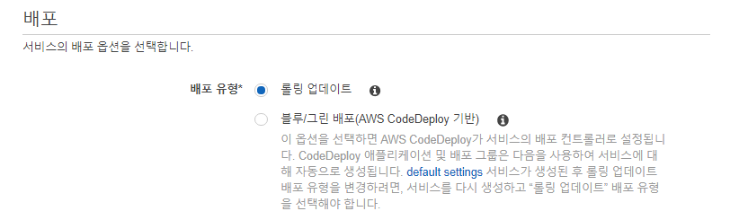 배포방식은 롤링 업데이트와 블루/그린 배포 두가지 방식을 제공합니다. 블루/그린 배포의 경우 aws code deploy 서비스를 통해 사용 가능합니다.