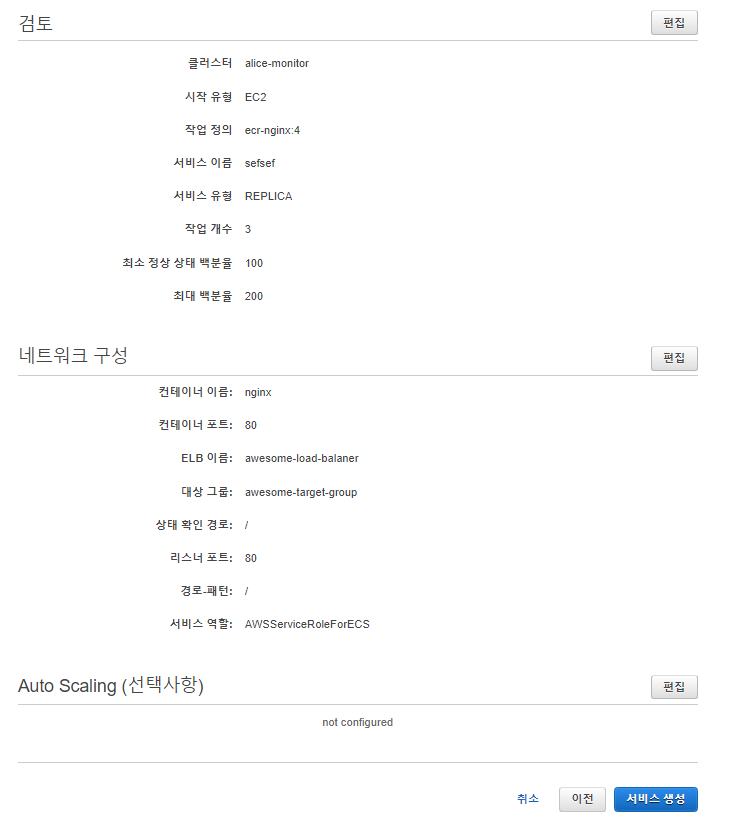 위의 설정들을 진행한 후에는 Review 과정을 통해 설정한 내용에 대한 확인 후 서비스를 생성하게 됩니다.