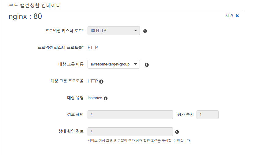 컨테이너를 추가한 경우 ALB에서 사용할 Listener와 Target group을 설정 할 수 있습니다.