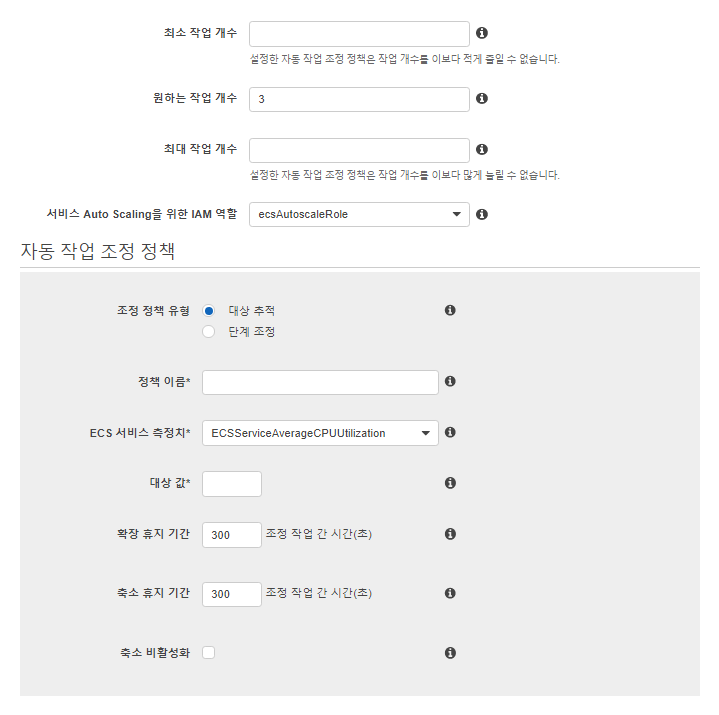 서비스에서 사용할 AutoScaling 정책설정에 대하여 진행합니다. 작업의 개수는 몇개로 적용할지, 최대로 적용할 작업 개수 등을 설정 가능하며 어떤 경우에 AutoScaling 정책을 발동하여 작업을 진행할 지 설정할 수 있습니다.