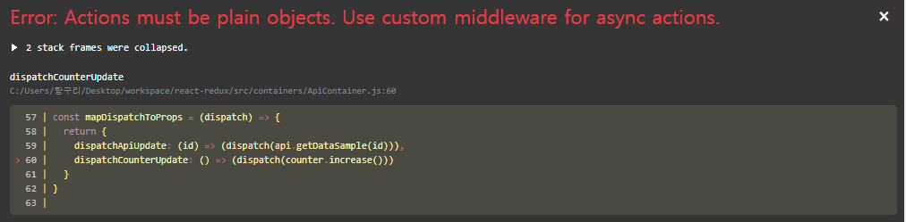 리덕스에서 기본적으로 액션 객체를 생성합니다. 하지만 async 함수를 통해 뭔가 비동기적인 작업이 이루어지게 되면 액션 객체에 대한 조작이 이루어질 수 있으니 다음과 같은 오류가 발생하는 것 같습니다.