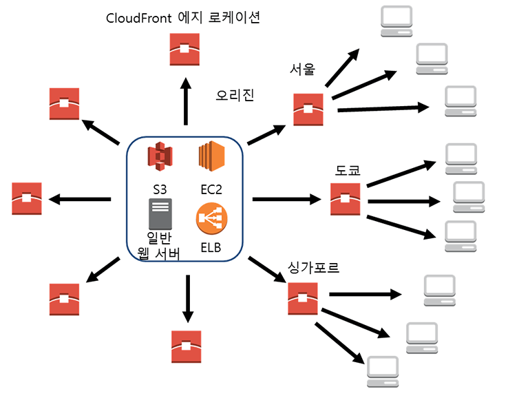 - Edge Server = Edge Location : AWS에서 실질적으로 제공하는 전 세계에 퍼져있는 서버입니다. Edge Server에는 요청받은 데이터에 대해서 같은 요청에 대해서 빠르게 응답해주기 위해 Cache 기능을 제공합니다.
