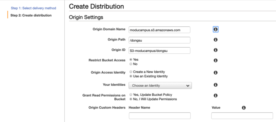 - Restritct Bucket Access(S3에 CloudFront만 접근할 수 있도록 설정)를 활성화시키면 Origin Accesst Identity(오리진 접근 시 식별자)에 관련된 옵션들이 활성화되고 기존에 만들어 놓은 Identity를 사용하거나 새로 만들 수 있다.