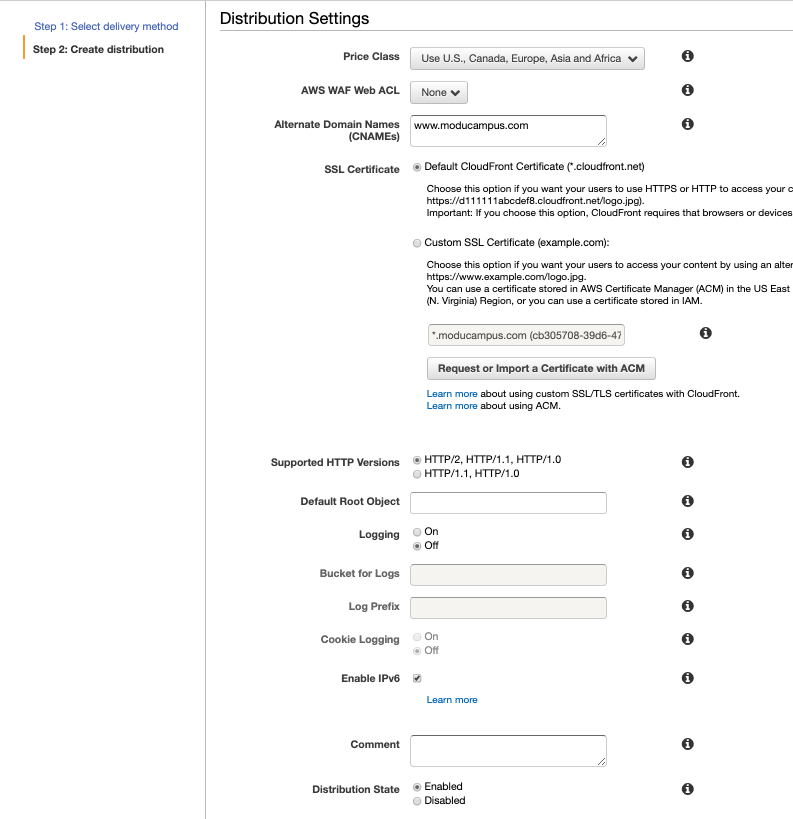 *Custom SSL Certificate : 사용자 지정 SSL 인증서를 사용, 개인 소유의 SSL 인증서나 ACM을 통해 발급받은 SSL 인증서를 사용