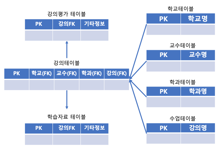 데이터관리를 좀 더 추후에 유용하게 그리고 깔끔하게 관리하기 위하여 학교,학과,교수,수업 각각의 테이블로 전부 분리를 진행하였습니다.